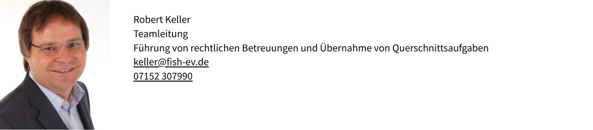Die rechtliche Betreuung unterstützt erwachsene Menschen, die aufgrund psychischer, geistiger oder körperlicher Einschränkungen ihre Angelegenheiten nicht selbst regeln können. Der Betreuungsverein FISH e.V. im Landkreis Böblingen führt gesetzliche Betreuungen mit Kompetenz, Herz und Verantwortung. Wir beraten Angehörige und ehrenamtliche Betreuer und fördern Selbstbestimmung, Würde und Sicherheit im Alltag.